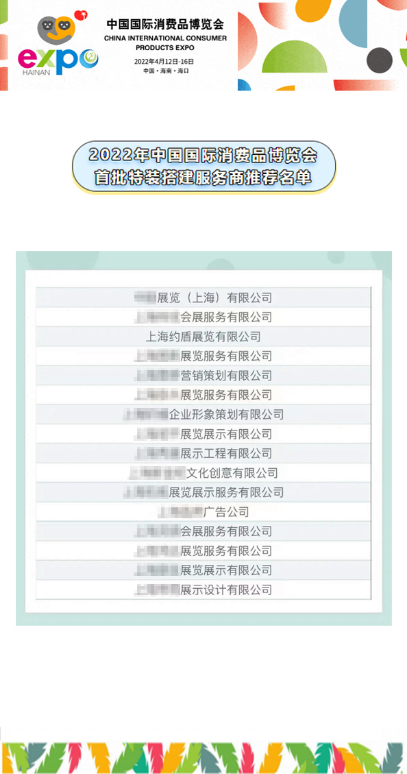 約盾展覽憑借著15年的全球運營經驗,入選“2022年中國國際消費品博覽會”特裝搭建商,上海區排名第三。約盾將會用專業的設計搭建團隊,為客戶帶來蕞優的體驗。