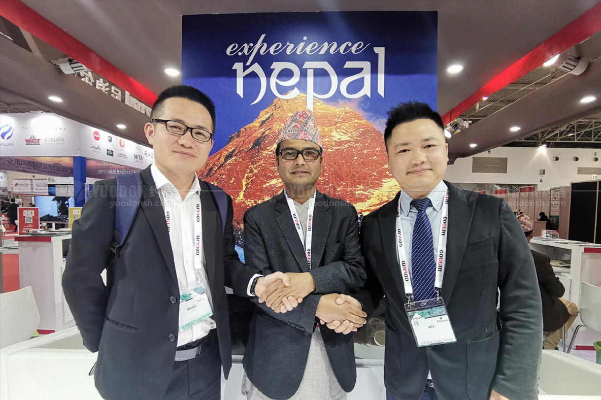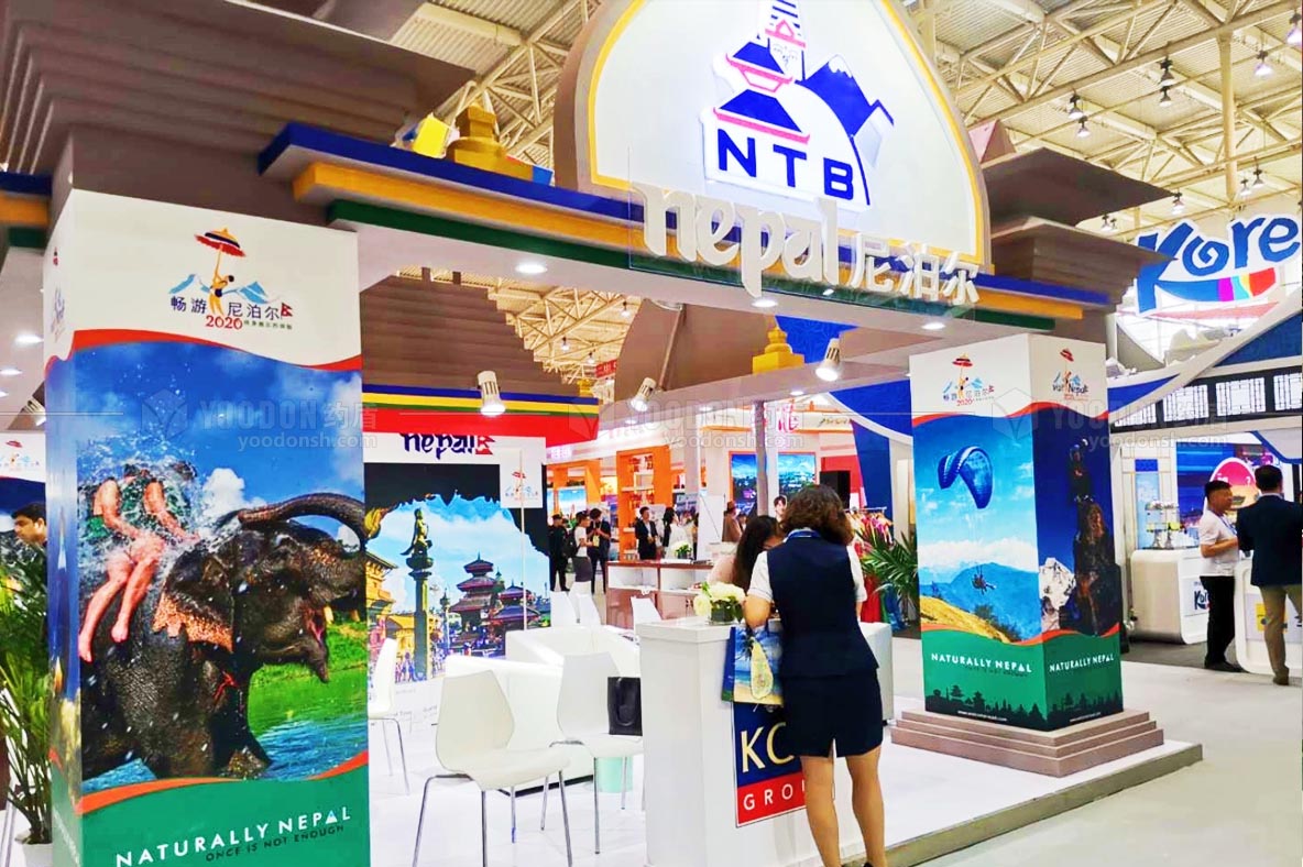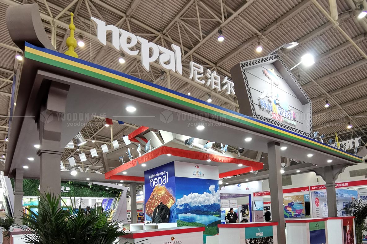 尼泊爾是南亞山區(qū)內(nèi)陸國(guó)家,是世界三大宗教之一佛教的發(fā)源地,其民族文化與中國(guó)有著巨大的差異性,所以我們?cè)谠O(shè)計(jì)尼泊爾展臺(tái)的時(shí)候,著重突出其獨(dú)具魅力的山川風(fēng)光和人文景象。尼泊爾的自然風(fēng)光為出境游提供了很多玩耍的項(xiàng)目,比如潛水、滑翔、騎大象、欣賞喜馬拉雅風(fēng)光、藍(lán)天白云;其豐厚的人文底蘊(yùn),獨(dú)特的民族文化創(chuàng)造了豐富燦爛的的佛教文化,比如佛教建筑、佛教禮俗、民族服飾等等。結(jié)合以上,設(shè)計(jì)師在設(shè)計(jì)的時(shí)候特別注意突出尼泊爾自身的獨(dú)特之處,展臺(tái)結(jié)構(gòu)也偏向于尼泊爾文化,在現(xiàn)場(chǎng)吸引了很多外來(lái)游客和展商。展臺(tái)中間是尼泊爾藏傳佛教的圣地博達(dá)哈大佛塔,俗稱"小西藏";站臺(tái)四周設(shè)置了休息區(qū)和洽談區(qū),門頭很高且采用發(fā)光燈箱的形式,色彩飽滿,能夠輕易捕捉到參觀者的視線。