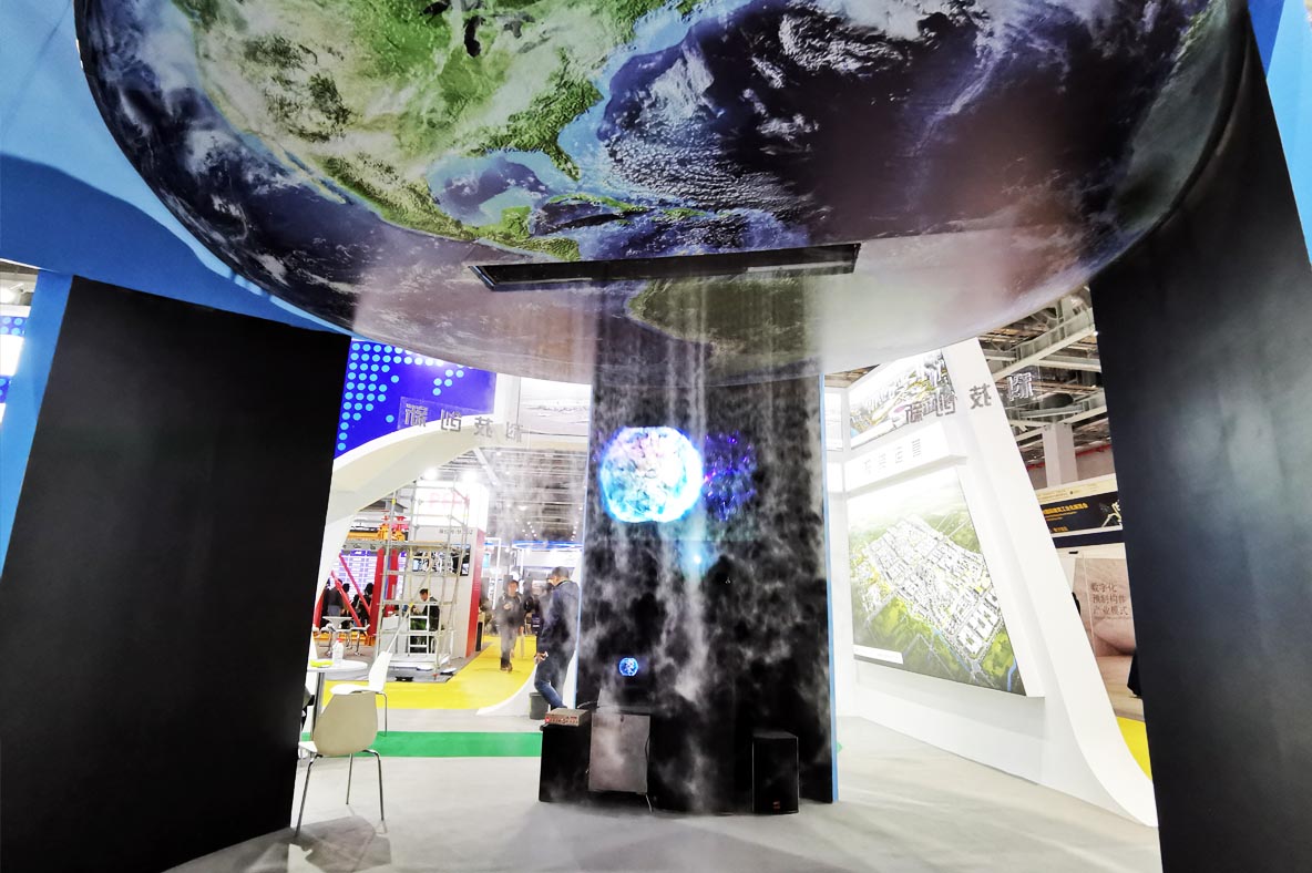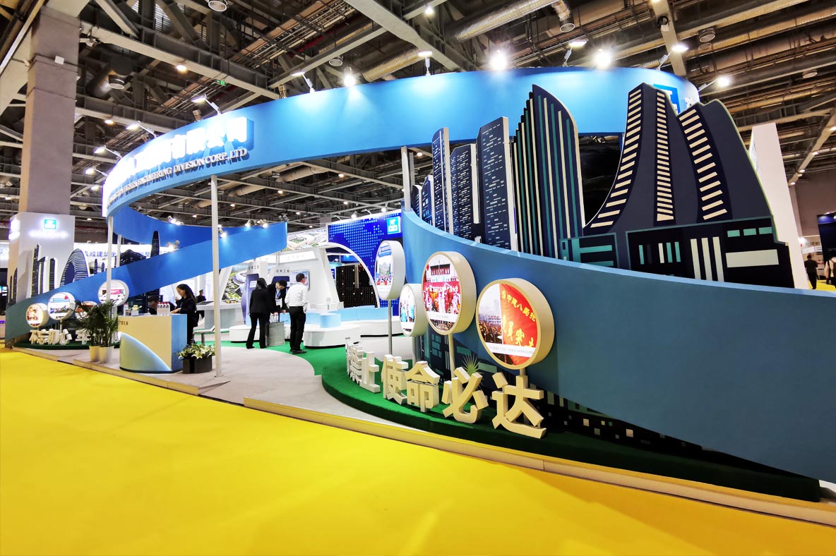 整體展臺設計緊緊圍繞“一帶一路”的主題,主色調采用大海一樣深邃的藍色,展示中國建筑寬廣的胸懷,描繪出充滿希望與活力的美好未來。用藍色曲線勾勒出“絲帶”,代表“絲綢之路”。藍色結構如絲帶一般貫穿著中建八局的海內外的地標工程,象征著中建八局公司在國家提倡一帶一路共同發展經濟計劃中共創經濟繁榮的成果,體現中建八局一直在鑄造精品的企業精神。整個展臺渾然一體,氣勢恢宏,奪人眼球。展臺門頭設計采用大的發光字來顯示,既可以突出企業形象,又將建筑八局的鐵軍文化“令行禁止 使命必達”和黨的指導方針“不忘初心 牢記使命”相結合,體現了中建八局以科學發展觀為根本指針、構建和諧企業的價值理念。展臺前端采用搭建行業高端技術“霧屏”來進行投影,頂部張貼3D地球寫真海報,效果逼真,形象生動地展示了建筑八局跨越五洲、業主至上的服務理念,和勇于創新、智慧創造的追求。