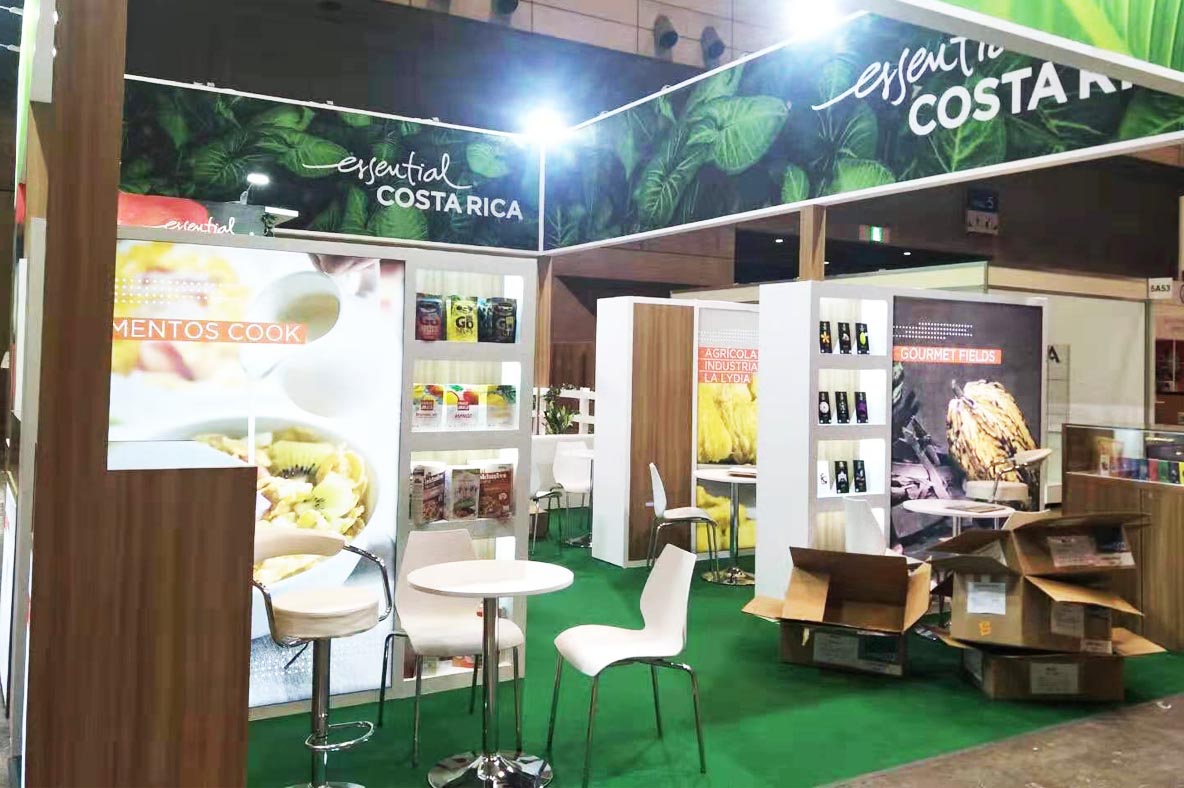 展臺分區展示不同產品,為不同的參展商分別設置接待臺和展示架,每個產品展示區放置兩個軟膜燈箱展示哥斯達黎加的特色,不同的產品展示區既各自獨立,又相輔相成,共同形成了一幅美麗的哥斯達黎加特色展。
